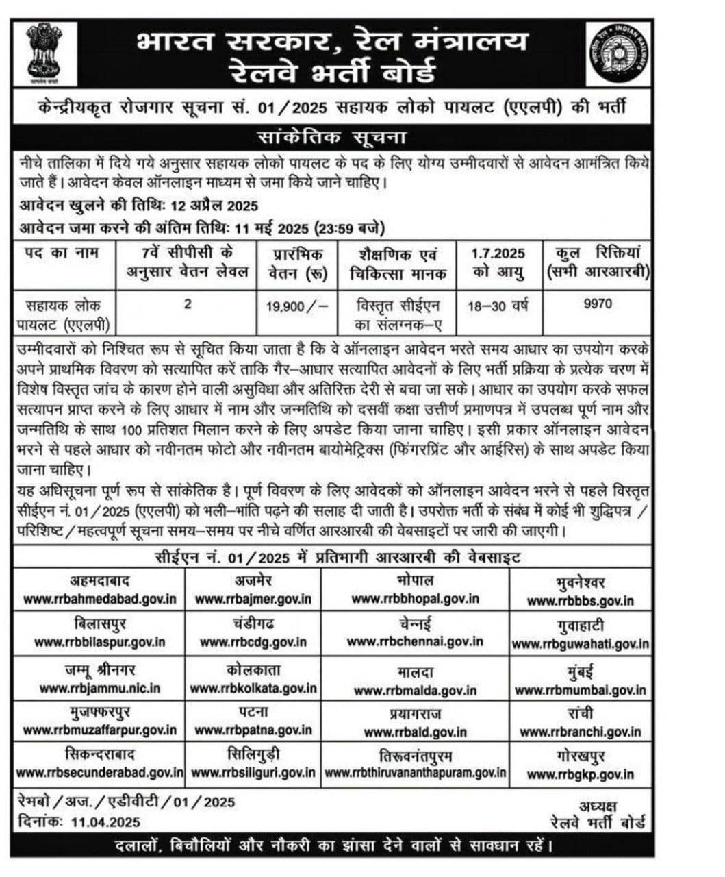 | Advertisement No. | RRB ALP CEN 01/2025 |